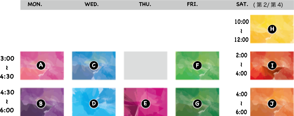 | スケジュール 毎週1回1時間30分のレッスンです。土曜日クラスは月2回2時間のレッスンです。 上記の時間割りからお選びください。(レッスン日カレンダーを参照ください。) |